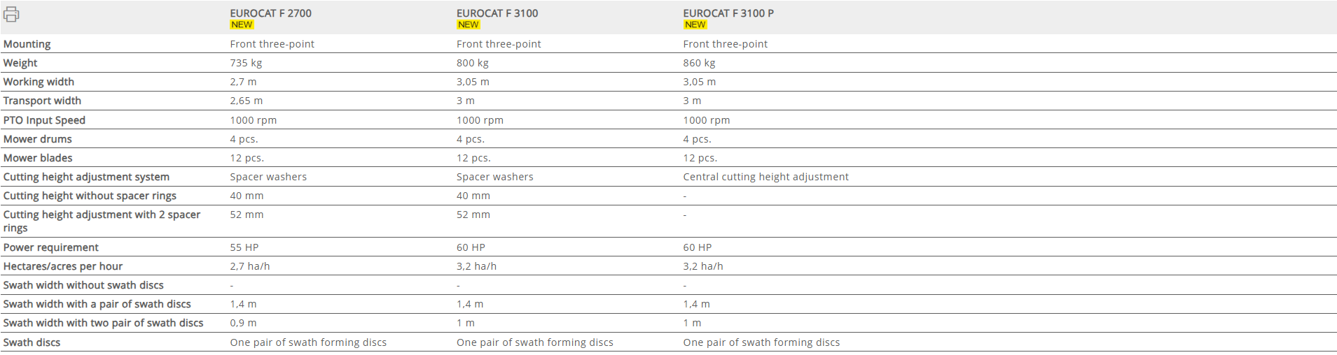 The EUROCAT F models are available with working widths of 2.70 m and 3.05 m.