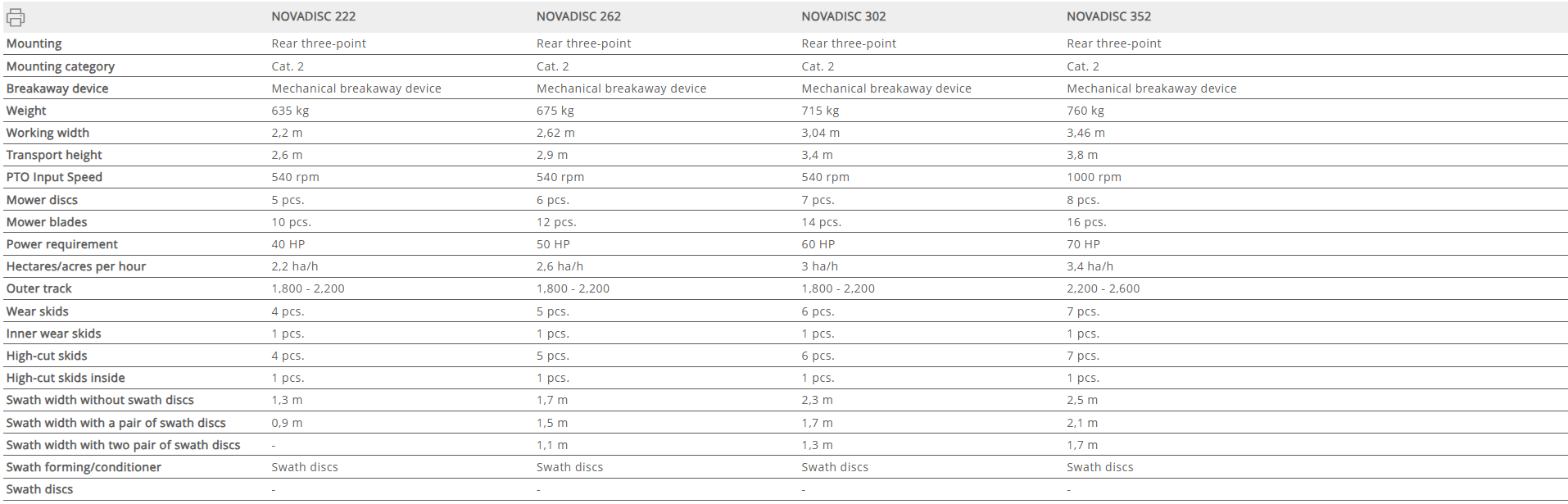 The NOVADISC rear mowers are available with working widths of 2.20 m / 2.62 m / 3.04 m / 3.88 m / 3.46 m.